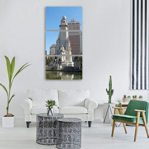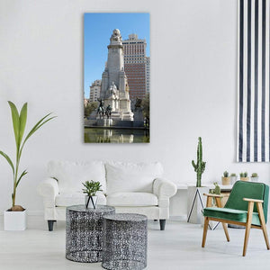 A realistic cityscape of a Madrid monument, featuring bronze horse statues and a reflecting pool. The symmetrical composition and bright palette of blues, whites, warm brick and muted greens create a grand, historic atmosphere. Suited to homes and offices that favor architectural or classic wall decor.