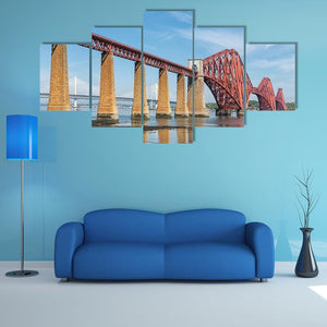 This realistic landscape depicts the railway bridge over the Firth of Forth in Scotland, with suspension spans, stone piers and a clear reflection in the water. Soft clouds and a red, blue and brown palette give the scene a majestic, peaceful mood that suits modern home decor.