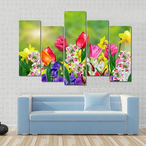 This canvas features a vibrant arrangement of daffodils, tulips, and irises set against a softened green backdrop. The cheerful colors shine through, capturing the essence of spring and bringing a fresh touch to your space.