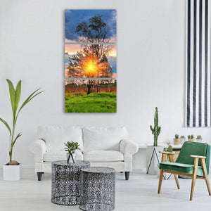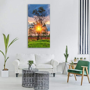 Sunset In Summer Field Canvas shows a centered field scene with a tree and the setting sun, sunlight shining through the branches. Its photo-realistic style and a palette of green, blue, orange, brown, and white create a serene, bright, peaceful mood that suits modern or nature-inspired rooms.