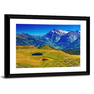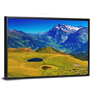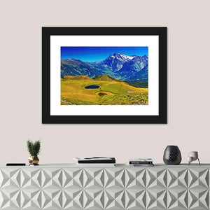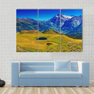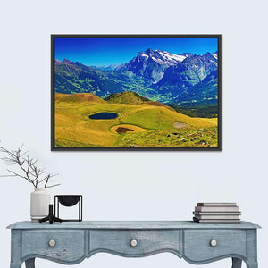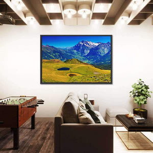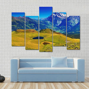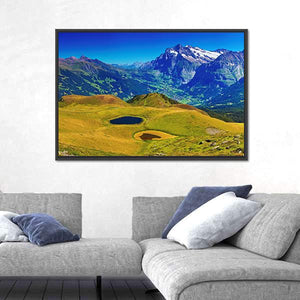 This canvas art beautifully captures the serene beauty of the Swiss Alps, featuring majestic mountains, two tranquil lakes, and lush green fields. Its picturesque landscape adds a touch of nature to your home decor, making it an inviting addition to any room.