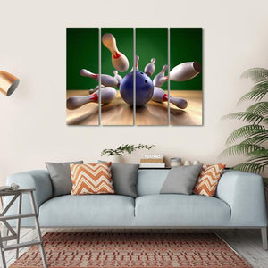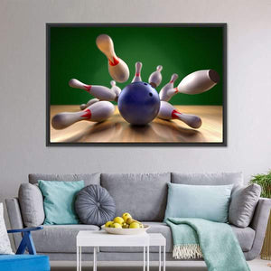 This canvas art captures the dynamic motion of a bowling ball striking down pins, creating a lively scene filled with energy. With a palette of blue, white, green, and brown, it adds an exciting atmosphere to any sports-themed decor.