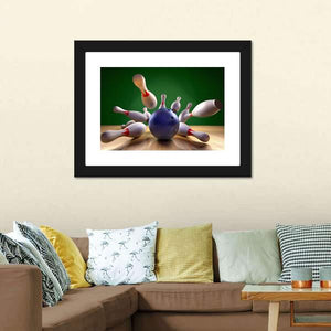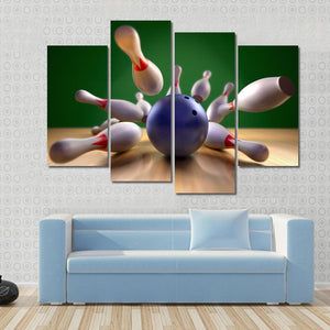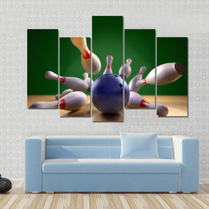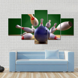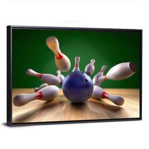 This dynamic canvas art features a striking moment of a purple bowling ball hitting scattered pins, captured in an energetic motion. The vibrant palette of blue, white, and green adds excitement to any space.