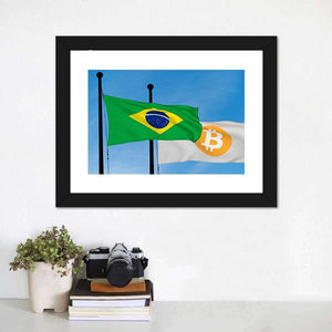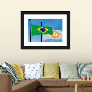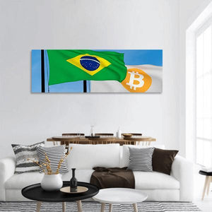 This panoramic canvas pairs the Brazilian flag with the Bitcoin symbol in a bold, modern abstract composition. The rule-of-thirds layout and a green, yellow, blue, orange and white palette add motion and visual energy, making it a strong focal piece for modern rooms or contemporary offices.