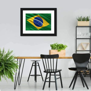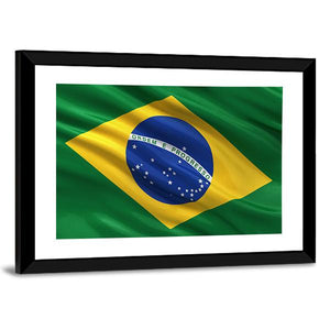 A waving Brazil flag rendered in realistic style, featuring the motto "Ordem e Progresso" at its center. The green, yellow, blue and white palette gives a patriotic, energetic feel that fits modern wall decor and living spaces.