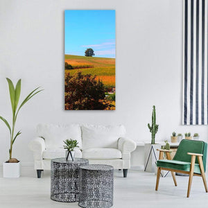 This realistic agriculture landscape shows a single tree on a rolling hill, open fields, and a broad sky. Soft blues, greens, yellows and oranges convey a peaceful, late-afternoon pastoral mood. The scene works well as wall decor in nature-inspired or modern rooms.