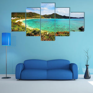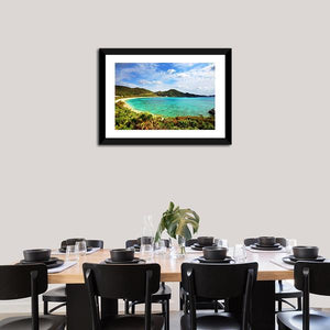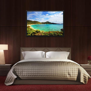 This canvas wall art captures the serene beauty of a tropical beach, featuring clear turquoise waters, lush green foliage, and fluffy white clouds. Ideal for adding a calm, inviting atmosphere to living spaces.