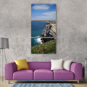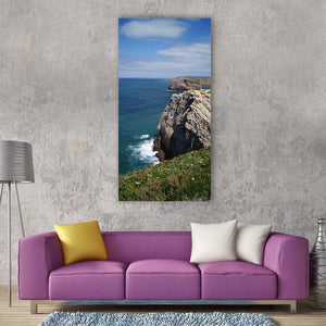 Algarve West Coast Beach in Portugal captures coastal cliffs, crashing waves, and scattered wildflowers along the shore. The realistic landscape uses a blue, green, gray and white palette to create a serene, majestic natural atmosphere. It suits coastal- or nature-inspired rooms and modern wall decor.