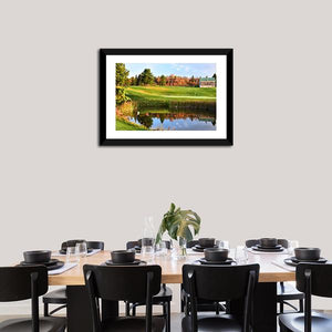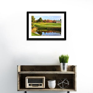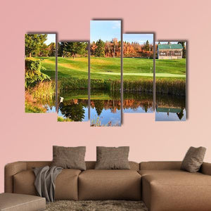 This realistic landscape shows a quiet scene at Algonquin Provincial Park: a golf green with flag beside reeds by a calm water feature, trees, and a building in the background, rendered in greens, blues, oranges, and browns. The overall mood is serene and peaceful, making it a natural fit for modern or nature-inspired rooms in the home.