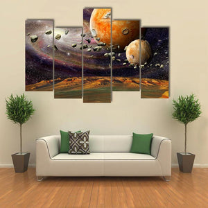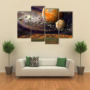 Alien Planet & Asteroid Belt shows two large planets, a swirling galaxy and an asteroid belt above an alien terrain. The colorful sci-fi digital scene reads as cosmic and mysterious, with orange, purple and black tones that give a surreal sense of depth. Suited to modern home decor and contemporary rooms.