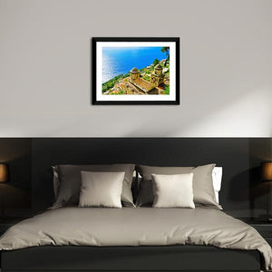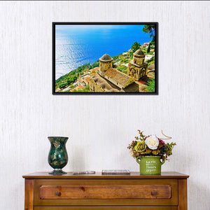 Amalfi Coast From Revello Village shows an aerial view of the coastline with domed church towers, tiled roofs, and terraces descending to the Mediterranean. Rendered in a realistic style with blue, green, tan, and white tones, the scene feels serene, picturesque, and quietly historic. It works well in coastal or Mediterranean-inspired rooms as a calm landscape focal point.