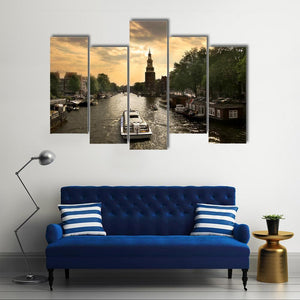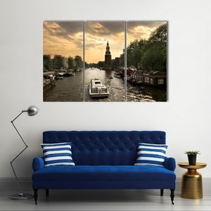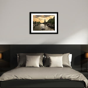 Experience the serene beauty of Amsterdam with this canvas wall art featuring a picturesque view of the Amstel River. A boat glides through the tranquil waters amidst charming houseboats and urban architecture, creating a perfect blend of nature and city life.
