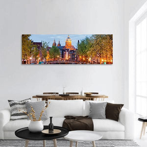 A realistic cityscape of Amsterdam at dusk featuring a canal, ornate buildings, trees, and a domed silhouette rendered in a cozy, nostalgic urban light. Golden lights reflect on the water across a warm palette of browns, greens, blues, and oranges, making this print well suited to modern or urban interiors as wall decor.