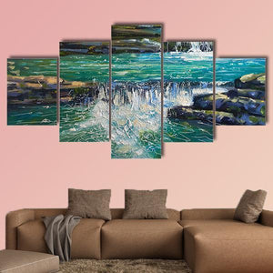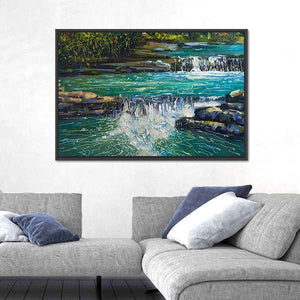 This waterfall painting depicts a flowing river, rocky falls, and lush foliage rendered in thick, textured impasto brushstrokes. The calm blue, green, white and brown palette creates a tranquil, refreshing, natural atmosphere that fits modern or nature-inspired rooms.