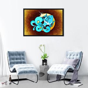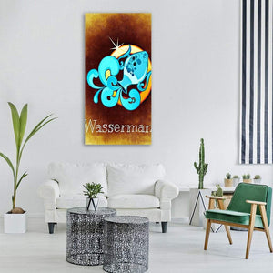 This Aquarius zodiac canvas centers a symbolic, decorative composition in an abstract, modern style. The artwork uses blue, yellow, brown, and white tones and includes the text Wasserman. Its decorative, modern look suits contemporary living rooms or home offices.