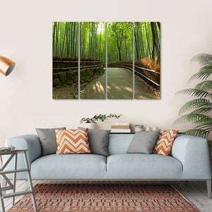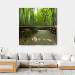 Experience the serene beauty of Arashiyama's bamboo forest with this captivating canvas wall art. Featuring a tranquil winding path bordered by a stone wall and wooden fence, the artwork captures the soft sunlight filtering through lush green leaves. It's perfect for adding a touch of nature to your space.