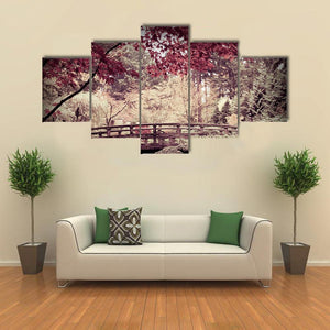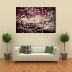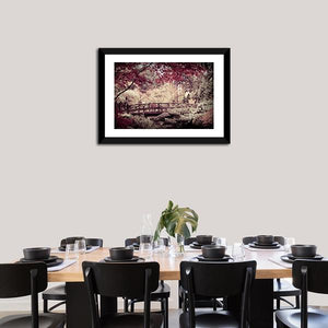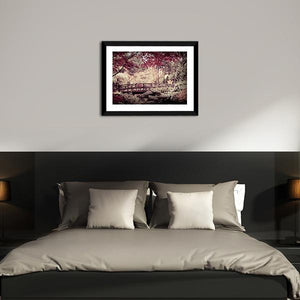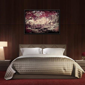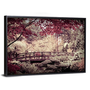 Arched Bridge In Japanese Garden presents a tranquil Japanese garden scene centered on an arched wooden bridge, dense foliage, and a pool of calm water. Warm autumn tones—red leaves with green and brown accents—and a subtle vintage feel create a serene, contemplative mood that works well in home room decor like a living room or study.