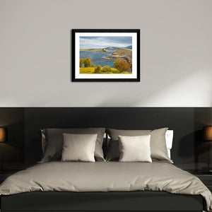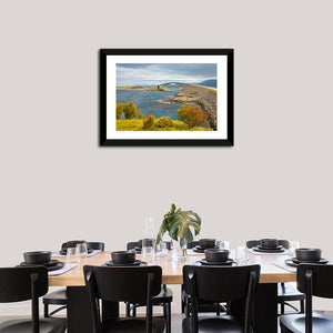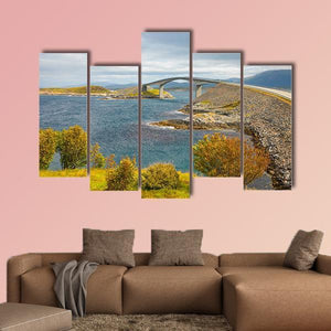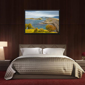 Atlantic Road, Norway shows a coastal bridge arching over rocky islets and open ocean, rendered in a realistic landscape style. Muted blues, greens, grays, and browns create a serene yet dramatic sense of depth. Suits modern living rooms or coastal-themed spaces as a calm focal point.