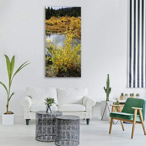 Autumn Forest Vertical Canvas presents a peaceful forest landscape with autumnal foliage and trees reflected on calm water. The realistic, nature-photography style and warm yellow, green, brown and blue tones create a natural, serene mood that fits nature-inspired room decor.