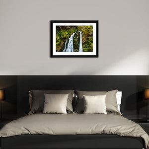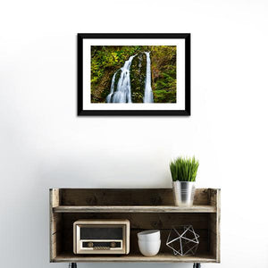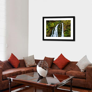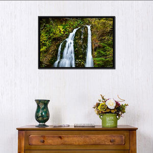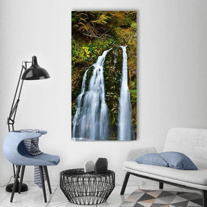 An autumn forest waterfall rendered in a realistic style, this canvas shows multiple streams of water flowing over mossy rocks amid autumnal leaves. Cool greens, browns, whites and hints of blue create a serene, refreshing mood, suitable for nature-focused or modern room decor.