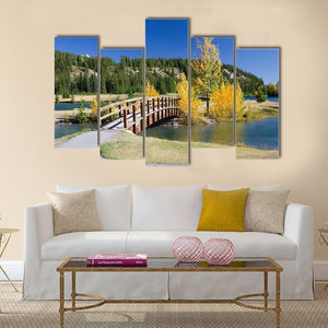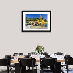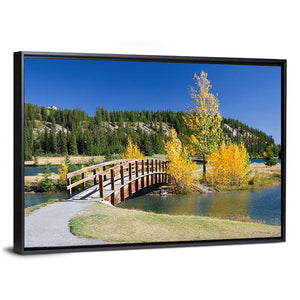 Banff National Park In Autumn Canvas Wall Art shows a curving wooden bridge and path leading to a calm lake, framed by autumn trees and a distant pine forest beneath a blue sky. The nature-photography print has a serene, autumnal mood and a blue, green, yellow and brown palette, making it a quiet fit for home room decor and modern interiors.