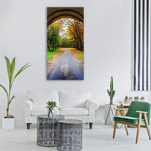 This autumn landscape canvas shows a tree-lined path framed by an archway, with fallen leaves and the sheen of wet asphalt. The realistic, serene scene—tones of green, orange, brown and gray—adds a peaceful, nature-focused touch to living rooms, hallways, or entryways.