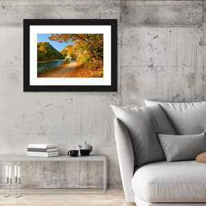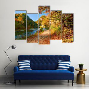 A peaceful, autumnal view of the Dunajec River on canvas, showing a tree-lined path and sunlight filtering through warm fall foliage. The scene uses leading lines and depth to draw the eye along the river and up the mountainside. It fits nature-inspired or rustic home décor as a calm focal piece.