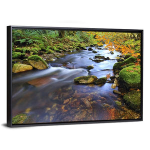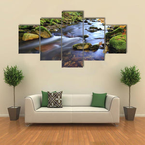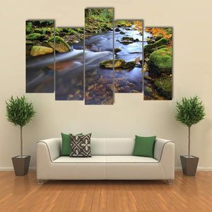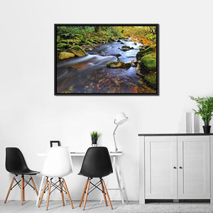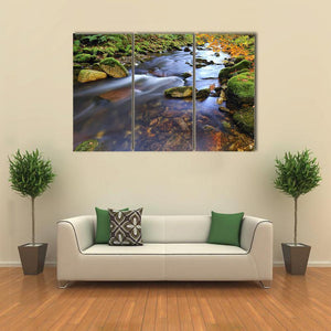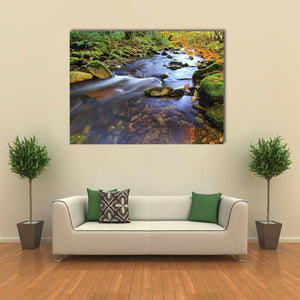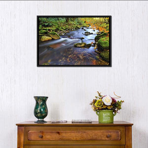 An autumn stream winds through a wooded scene of rocks and foliage, captured with motion blur in the flowing water. Water-smoothed and moss-covered stones sit among greens, browns, blues and soft yellows to create a tranquil, natural mood. Works well in rustic or nature-themed rooms in the home.
