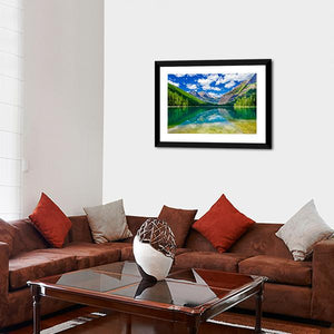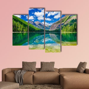 Avalanche Lake in Montana captures a calm lake, forested mountains and a clear blue sky, with the water mirroring the peaks and revealing pebbles at the shore. The green-and-blue palette gives a serene, natural mood that fits modern living rooms or bedrooms.