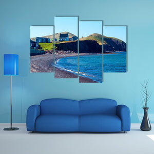 Capture the serene beauty of coastal houses overlooking a rocky beach in this stunning piece. The calming palette of blue, green, and grey evokes a peaceful atmosphere, making it a perfect addition to any room.