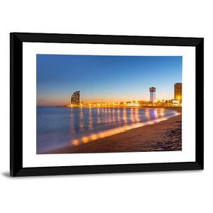 Beach in Barcelona places the shoreline and city skyline together, with lights from city buildings reflecting on the water. Blue and golden tones create a serene, vibrant evening mood that works well in modern or coastal room decor.