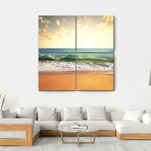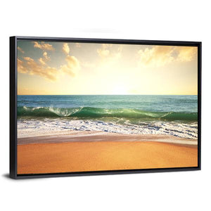Bring a touch of serenity to your space with this stunning canvas art featuring a beach scene. The soft blues of the ocean waves blend beautifully with the warm oranges and yellows of the sunset sky, creating a peaceful atmosphere that invites relaxation.