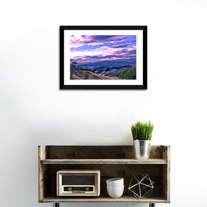 High Mountains In Thailand shows a layered mountain range, valley and terraced hills beneath pink and purple clouds that suggest sunrise or sunset. The composition emphasizes depth and perspective for a serene, atmospheric, majestic feel that suits modern living rooms or bedrooms and other home spaces.