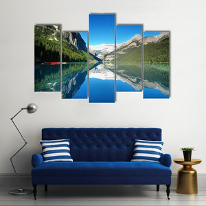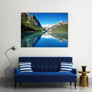 Explore the tranquility of Lake Louise with this majestic canvas wall art. Featuring a calm lake reflecting snow-capped mountains and dense green forests, it brings a serene touch to any space.