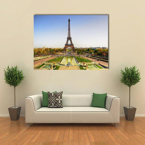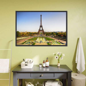 This beautiful canvas features the iconic Eiffel Tower, framed by lush gardens and a fountain. Captured in a wide shot, it exudes a grand and picturesque vibe, perfect for bringing a touch of Parisian charm to your space.