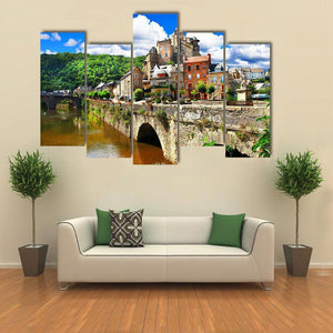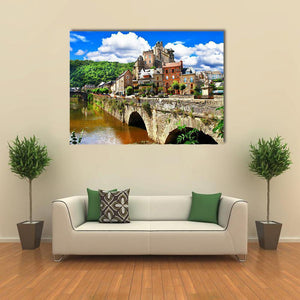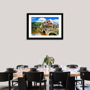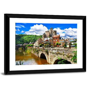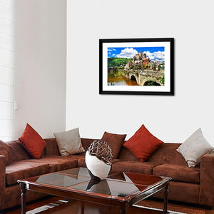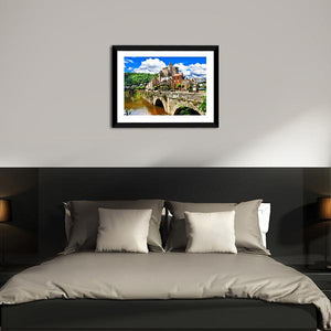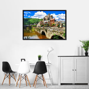 This canvas art beautifully depicts a picturesque landscape of France, featuring a serene stone bridge over a gentle river, with historic buildings clustered on a hill. The vibrant blue sky and lush green hills create a calm atmosphere, making it a charming addition to any space.
