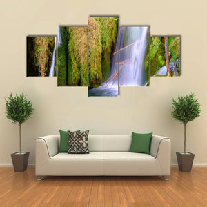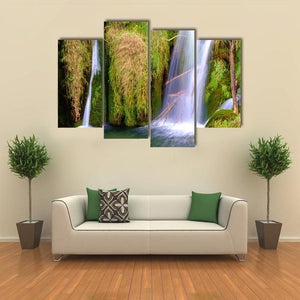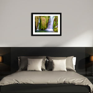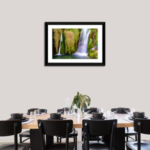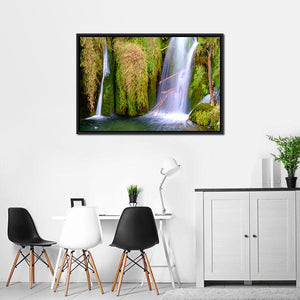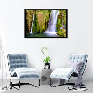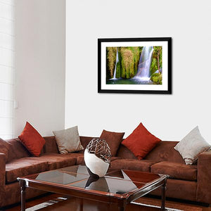 This canvas art captures the serene beauty of a waterfall surrounded by lush greenery and moss-covered rocks. The refreshing scene features flowing water, evoking a sense of natural tranquility that can enhance any space.