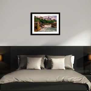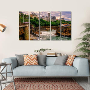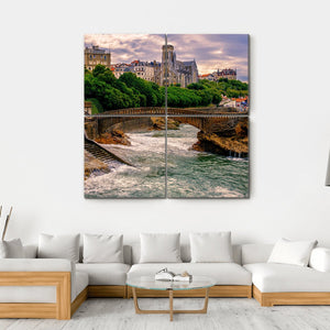 This captivating landscape artwork showcases Biarritz, France, featuring a picturesque scene with an arched bridge, a church, and quaint stone buildings. The warm hues of brown and green blend beautifully with hints of blue and grey, capturing a historic moment at sunset.