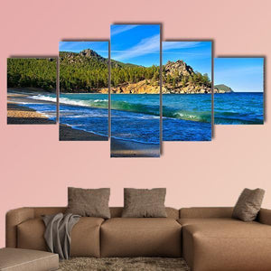 Lake Baikal, Russia captures a shoreline scene with crashing waves, a pine forest and a rocky outcrop beneath wispy clouds. Realistic, vibrant blues, greens, browns and whites give the piece a serene, natural mood. It works well as nature-focused wall decor in modern living rooms or entryways.