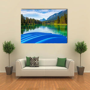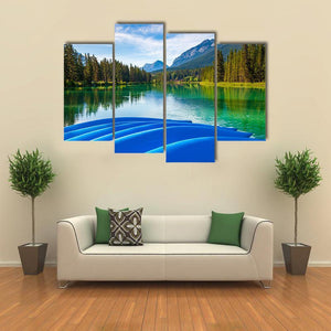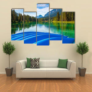 Blue canoes rest on the Bow River, stacked in the foreground with clear reflections in the water and mountains and trees beyond. The realistic, vibrant landscape creates a serene, natural mood and works well with house or modern decor.