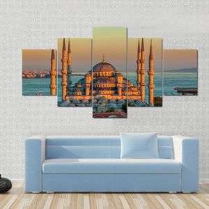 This canvas features the iconic Blue Mosque of Istanbul at sunset, showcasing its multiple minarets and stunning dome against a serene waterfront. The peaceful color palette of blue, orange, and gold creates a calming atmosphere, perfect for any space.