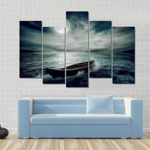 This captivating canvas art features a rowboat gently drifting on a stormy ocean under a full moon, with a flock of birds soaring above. The dramatic blues and blacks create a mysterious atmosphere, perfect for adding depth to any space.