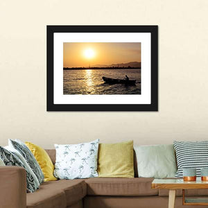 This serene canvas features the silhouette of a person in a boat against a tranquil sunset over a lake. The warm palette of orange, yellow, and black captures a peaceful evening mood, making it a lovely addition to any wall space.