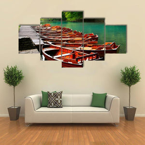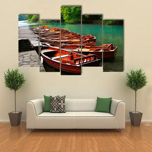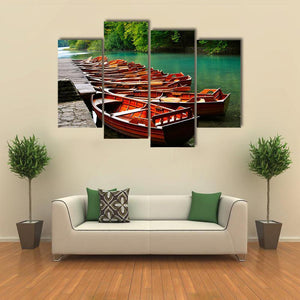 This canvas art features serene boats nestled by a tranquil green lake, surrounded by lush trees. It brings a natural, calming vibe to any space, perfect for nature lovers.