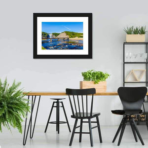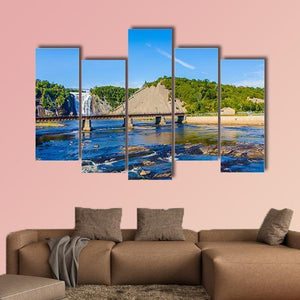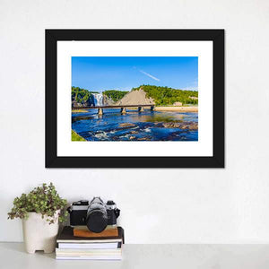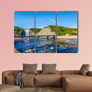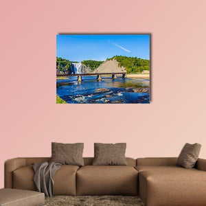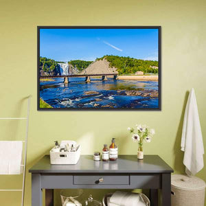 Montmorency Falls & Bridge Canvas Wall Art presents a realistic landscape of a waterfall, river and adjacent bridge with a thatched roof detail. The composition follows the rule of thirds and pairs cool blues and greens with brown and white accents for a serene, natural mood. It fits modern or nature-inspired rooms and will serve as a scenic focal point in living spaces or entryways.