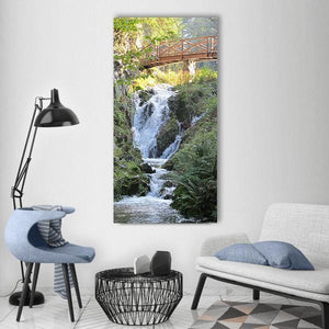 A wooden lattice bridge crosses a cascading waterfall, framed by mossy rocks and lush foliage. The scene feels serene and refreshing, rendered in greens, blues, browns, and whites with a rustic, natural mood. Suits nature-inspired or rustic rooms as calm wall decor.