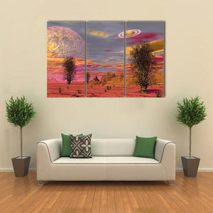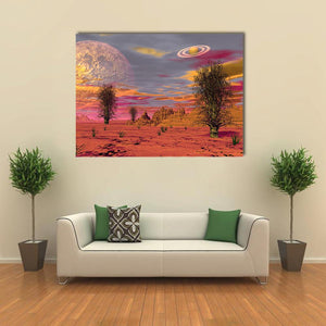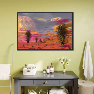 Explore a captivating desert landscape filled with abstract rock formations and sparse vegetation, illuminated by a vibrant, dramatic sky. This canvas art evokes an otherworldly atmosphere, making it a striking addition to any space.