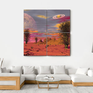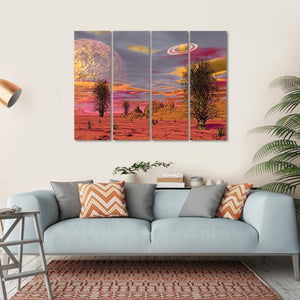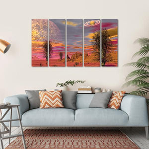 This canvas artwork depicts an otherworldly desert landscape featuring a large moon and rocky formations beneath a dreamy sky. Its warm palette of orange, pink, and gray invites a surreal atmosphere, making it a captivating piece for any nature-inspired decor.