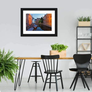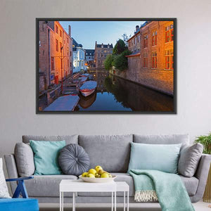 This canvas print features a serene canal scene in Belgium, framed by picturesque buildings and boats. Its calm colors of blue, orange, and brown evoke a tranquil atmosphere, making it a beautiful addition to any art collection.