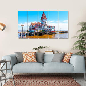 This captivating canvas features an ornate white and red building centered on a wooden pier, surrounded by calm water and a clear blue sky. The sunny and inviting scene evokes a sense of serenity, making it a beautiful addition to any space.